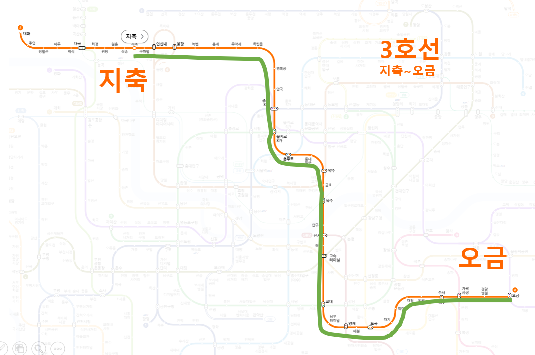 | 지하철 세부 노선 | (1호선) 온수/금천구청 ~ 도봉산 (2호선) 전구간 (3호선) 지축 ~ 오금 (4호선) 남태령 ~ 당고개 (5호선) 방화 ~ 강일/마천 (6호선) 전구간 (7호선) 온수 ~ 장암 (8호선) 전구간 (9호선) 전구간 (우이신설선) 전구간 (신림선) 전구간 (공항철도) 김포공항 ~ 서울역 (경의중앙선) 수색~ 양원/서울역 (경춘선) 청량리/광운대 ~ 신내 (수인분당선) 청량리 ~ 복정 |