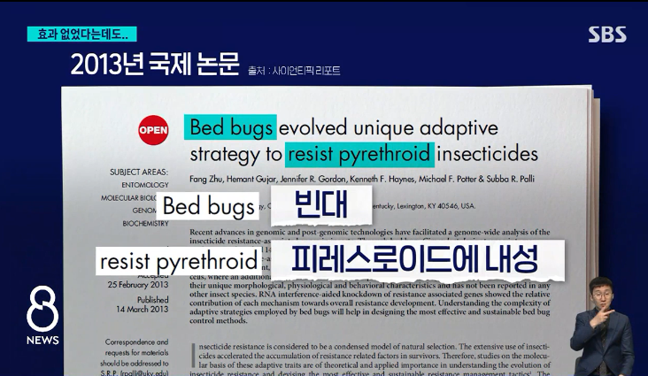 정부가 권장하는 피레스로이드는 빈대를 담궈놔도 죽지 않는다는 연구가 10년전에 공개되었고, 네오니코티노이드의 디노테퓨란 성분의 살충제가 실제로는 유의미한 효과를 보인다고 보도되고 있습니다.