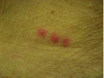 ✅ 종종 가렵고 가운데에 작은 구멍이 있는 붉은 반점, 딱딱하고 융기된 덩이, 또는 두드러기(부스럼)