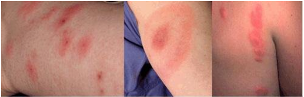 이는 선 모양의 패턴으로 나타나거나 군집되어 보일 수도 있습니다. 2 또는 3개의 물린 자국이 그룹을 짓거나 원형의 형태를 보이는 것이 특징입다. 대부분 팔 또는 어깨에 주로 물리지만, 온 몸에 물릴 수도 있습니다. 젊은이들보다 노인들에서 증상이 발생하는 빈도가 덜합니다. 물린 자국은 약 1주 후에 사라집니다. 물린 부위를 긁는 경우, 감염이 발생할 수도 있습니다.