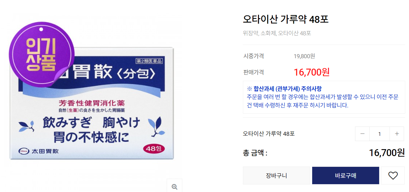 | 더부룩, 소화안돼요 | 소화불량 | 1. 오타이산 일본여행시 꼭 구매해오는 제품 만년 소화불량으로 10년째 고생중인 나에게 광명을 찾아준 소화제, 온갖 효소와 약을 달고 살았던 나에게 한방에 치료되는 치료제같음. 숙취해소에도 도움을 준다고함 ![]() |