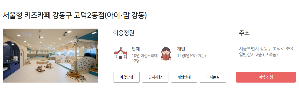| 성동구 금호키즈카페 | 단체 : 30명 개인 : 14명 |