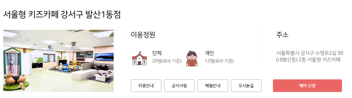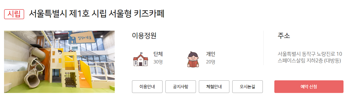 | 서울형키즈카페(대방동) | 단체 : 30명 개인 : 20명 |