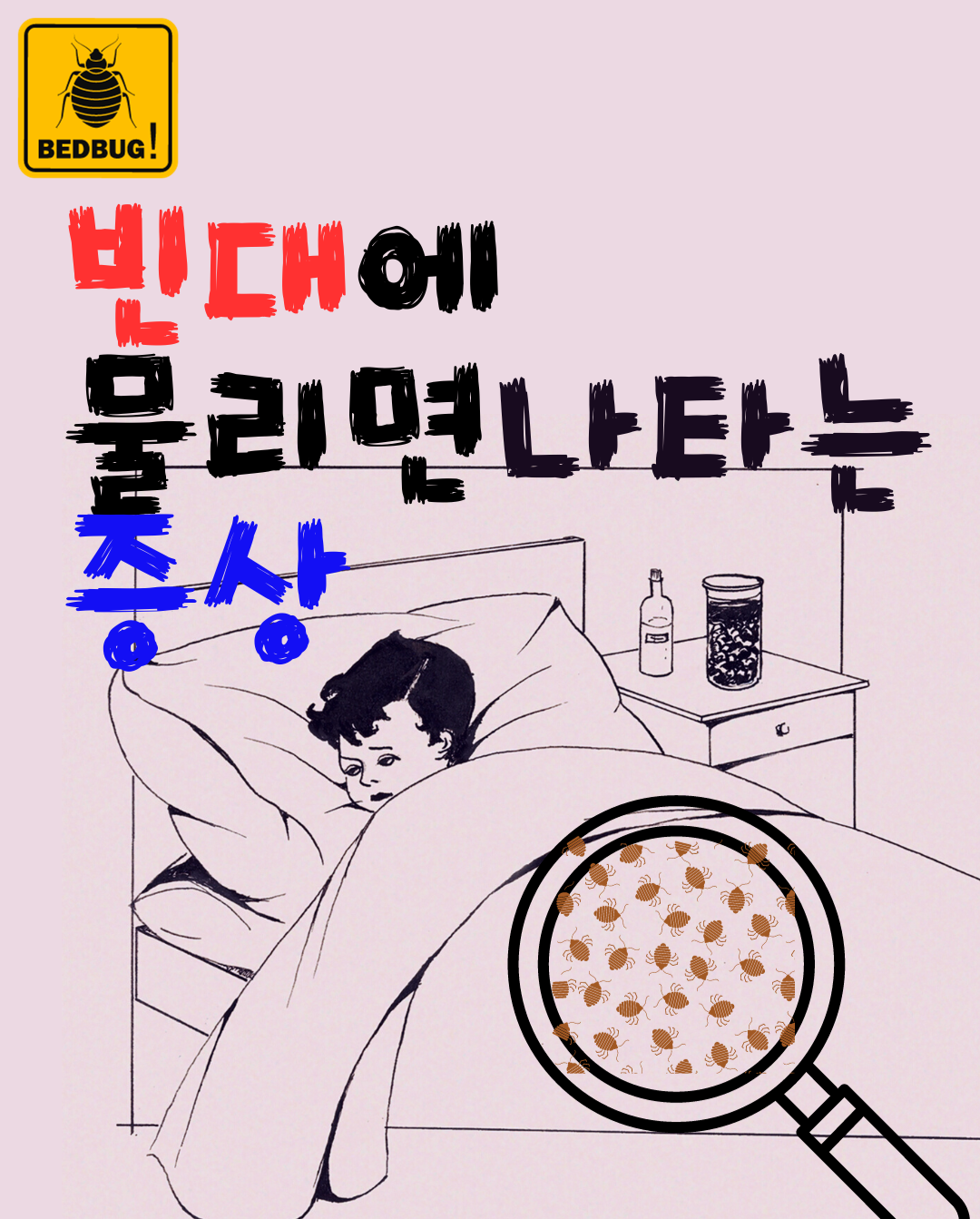보통 모기는 물리면 바로 가려우나, 빈대에게 물리면 10시간에서 3일정도의 잠복기를 가집니다.