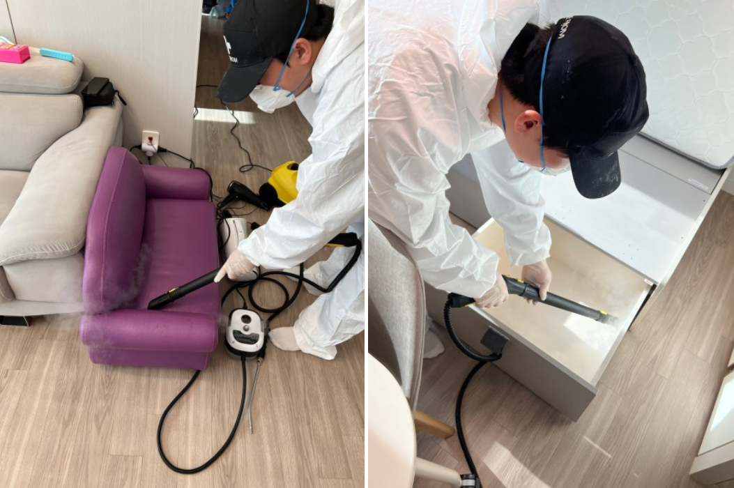 대표적인 것이 이산화탄소 훈증, 공기 가열 등. 고압 수증기 청소나 건조 수증기(dry steam vapor)를 이용한 청소업체도 많습니다.