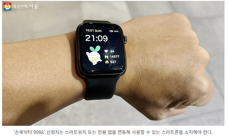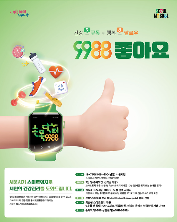 서울시는 11월 27일부터 ‘손목닥터 9988’ 참여자 7만 명을 추가 모집한다. 시민 모두가 99세까지 88(팔팔)하게 산다는 의미를 담고 있는 ‘손목닥터 9988’은 서울시가 시민의 건강생활 습관 형성과 건강증진을 위해 정보통신 기술(ICT)을 활용해 선도적으로 시작한 스마트 헬스케어 사업이다.