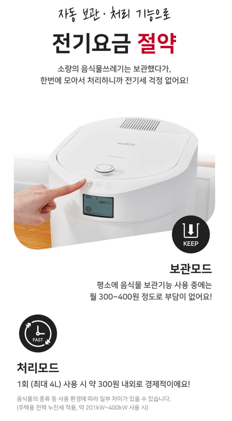 | 웰릭스 음식물처리기 CAN-400 | - 최대 4L처리 - 출시일 2022년 5월 - 저소음 - 월 300원에서 400원의 전기세 - 자동보관 & 처리 - 빠른 처리시간 - 자가진단 - 셀프 살균세척 |