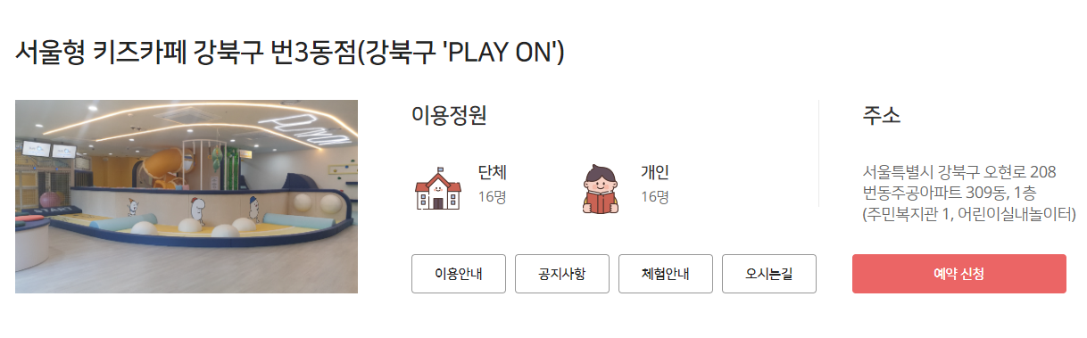 | 성동구 금호키즈카페 | 단체 : 30명 개인 : 14명 |