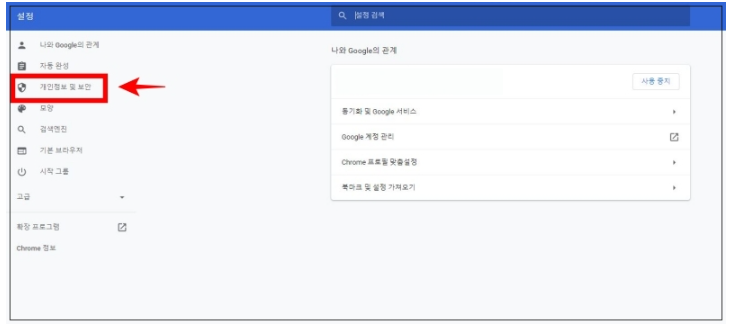 4. 왼쪽 메뉴중 '개인정보 및 보안'을 클릭합니다. |