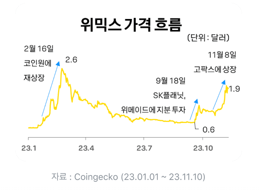 약 9개월이 지난 2023년 11월 8일부터 국내 주요 가상화폐 거래소 중 하나인 고팍스에서 위믹스 거래가 가능해지면서(상장), 위믹스 가격은 다시 상승했습니다. 고팍스를 시작으로 국내 주요 거래소들이 위믹스 거래를 다시 허용할 것이라는 기대감이 퍼진 것. 거래소에 다시 상장되는 것이 반드시 가상화폐 가격 상승으로 이어지지는 않지만, 거래를 지원하는 곳이 많아질수록 투자자들의 접근성이 높아져 거래량이 많아질 가능성도 높아집니다.
